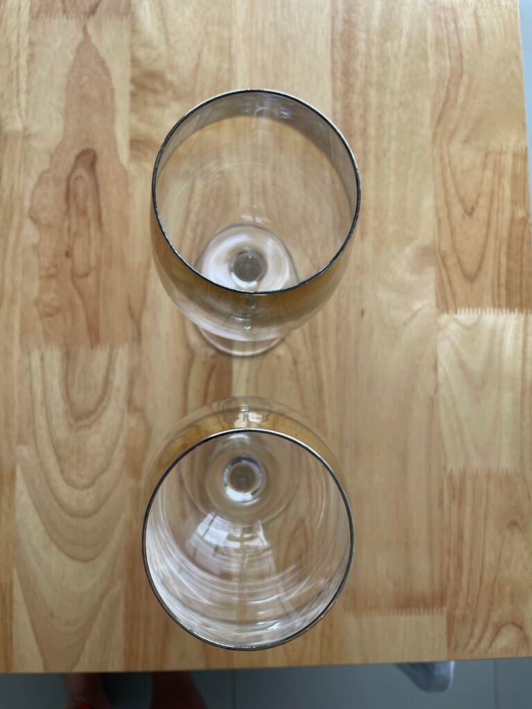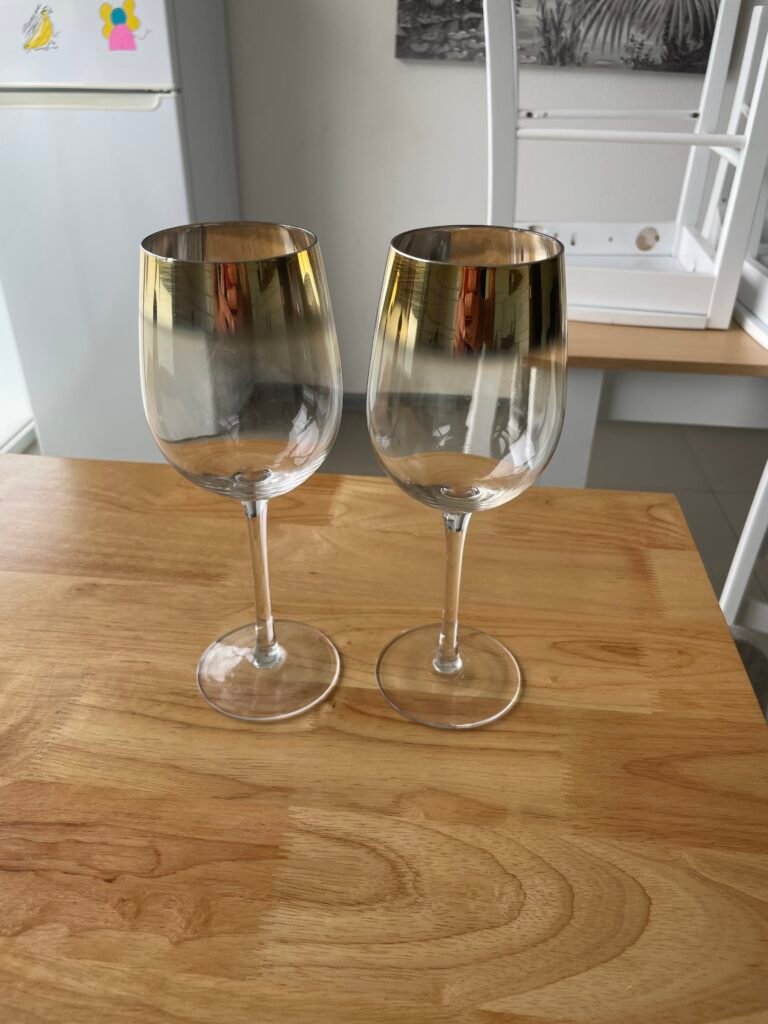 je vends mon lot de deux verres à vin neufs – avec un design doré sur la partie supérieure.